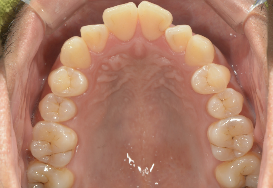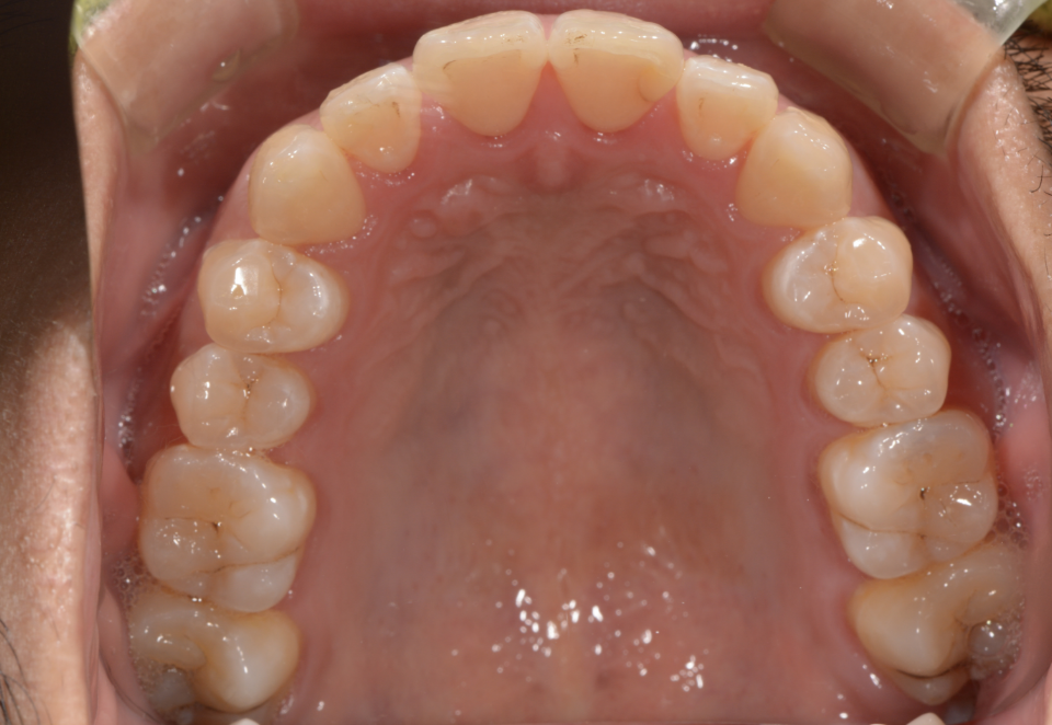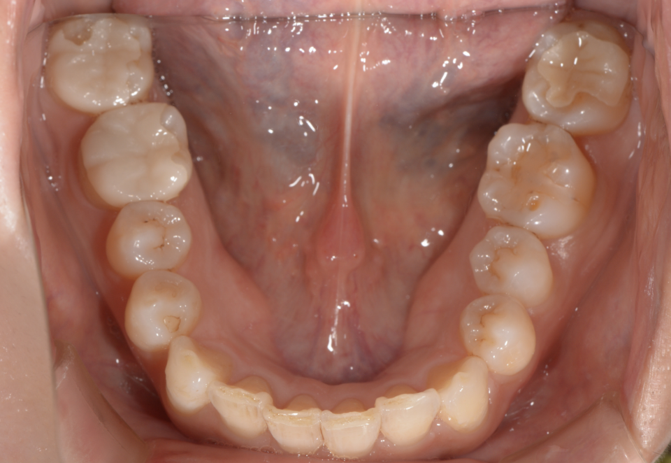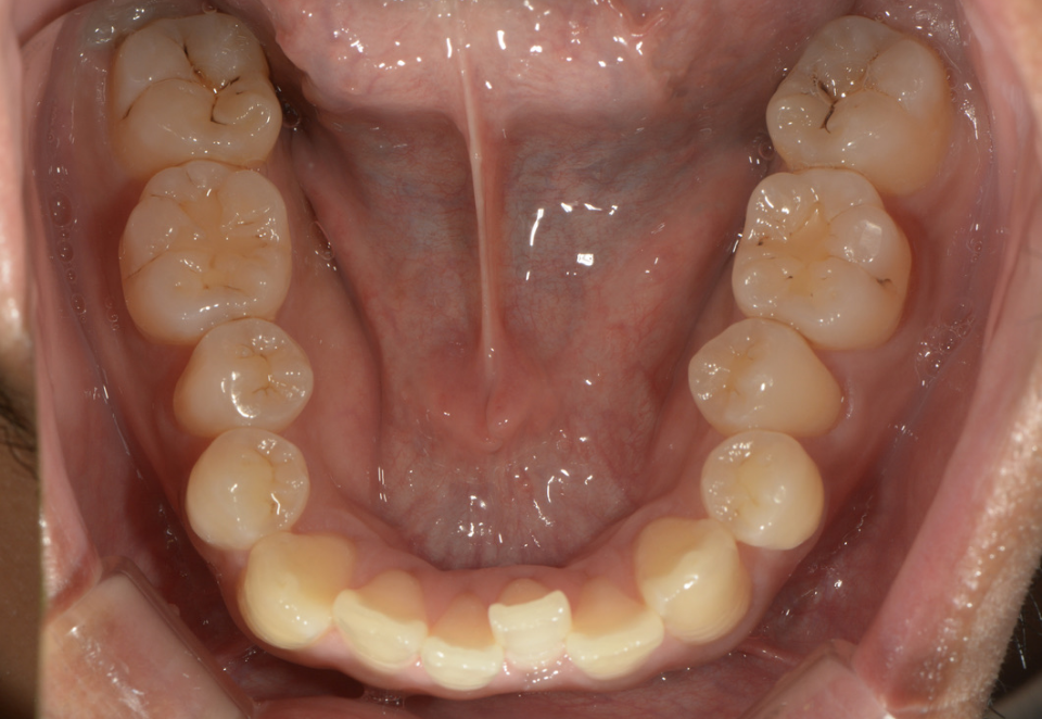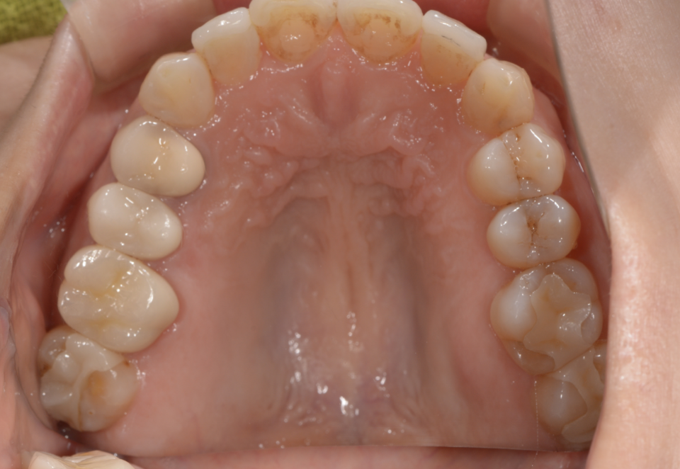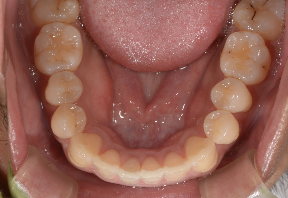上は裏側矯正で下が表側矯正のコンビネーションで矯正治療を行います。目立つ上のみを裏側にすることで、装置が目立つのを抑えています。出来る限り目立たせたくない方におすすめです。