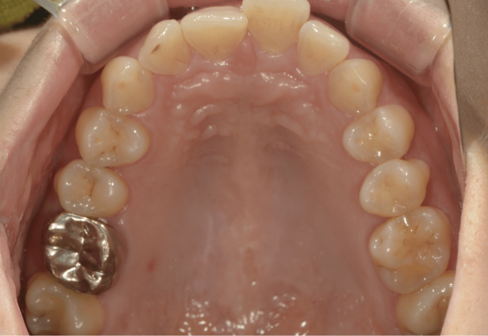 上は裏側矯正で下が表側矯正のコンビネーションで矯正治療を行います。目立つ上のみを裏側にすることで、装置が目立つのを抑えています。出来る限り目立たせたくない方におすすめです。